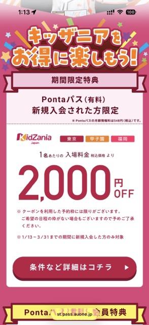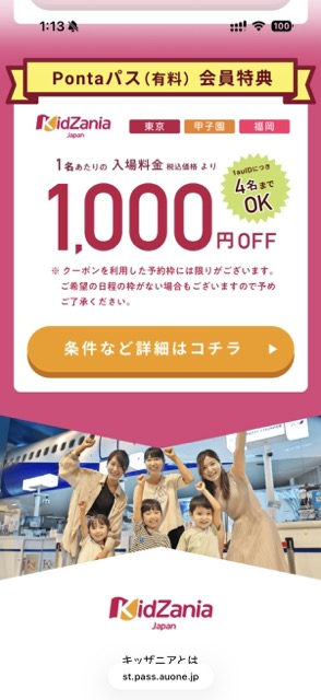 Pontaパス会員になったら、次にキッザニアの予約をします。スマホからPontaパス用の予約ページにアクセスします。「条件など詳細はこちら」をタップします。
